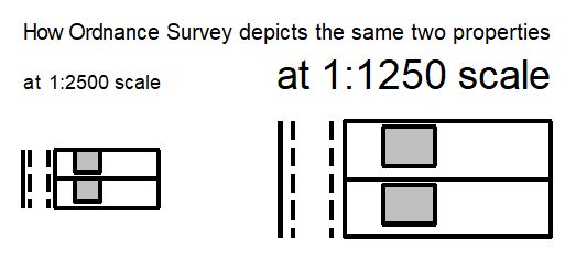 The fine line on an Ordnance Survey maps is 0.2 mm wide on the paper. This 0.2 mm scales up to 250 mm wide on the ground if you are using a 1:1250 scale map of an urban area, or to 500 mm wide on the ground if you are using a 1:2500 scale map of a rural area. In addition, the line on the map may have been drawn in a position that is up to 1 metre away from the true position of the ground feature represented by that line on a 1:1250 scale map, and up to 2 metres, sometimes more, on a 1:2500 scale map.
